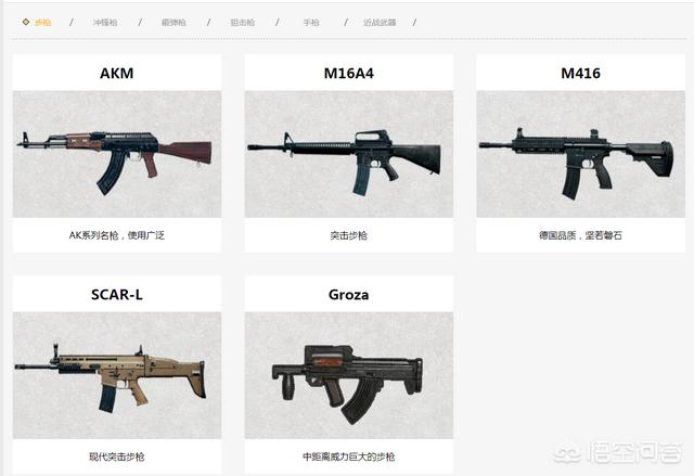第一:M416,这把枪是目前使用最多的,满配后伤害很可观,但是有一点就是对配件的要求太高,如果没有这些配件,后坐力太大,而且不好瞄准,不推荐新手使用