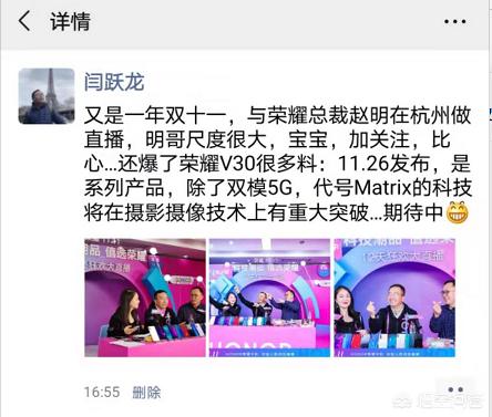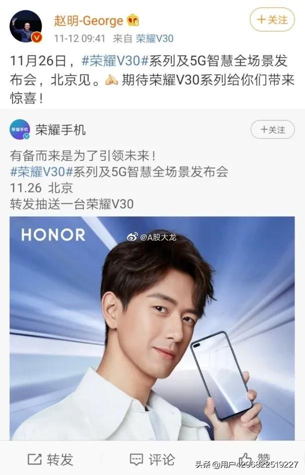 今天天猫双11直播,荣耀总裁照明也是在直播间透露,荣耀V30将于11月26号在北京发布。