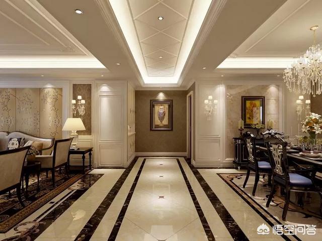 而针对玄关来说,直接可以在客厅与餐厅之间做一个走廊造型顶,样式根据风格来选做,正对门口的那个墙做一个背景墙,放照片或者画来装饰就很漂亮的,给图参考。