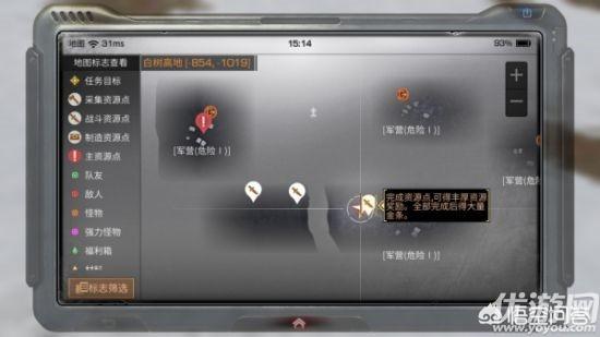 任务主线升级,101级之后的白树高地任务,进图4个资源点如图,这个任务每日做完给500金条,各类初级资源若干,且每日刷新一次,有叹号的资源点为营地士兵,新手建议不要单挑,两人或三人组队很容易打。收集好物资后可以从地图上橘黄色传送门标志即直升飞机处返回营地,这边要提示下梦新,感染物品自动存放仓库点一下,因为你在营地外收集的物资都是感染物品,只能通过托运带回营地,放在背包坐飞机回直接删除物品,自动存放仓库之后即使忘记托运也不用担心,去仓库找就好了。