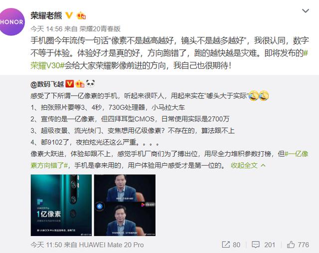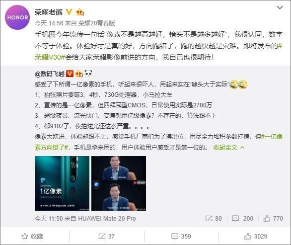 还有一点很有意思,今天荣耀老熊微博里转发了一篇数码大V关于小米CC9Pro一亿像素的评论文章,并且评论"像素不是越高越好"。从老熊的态度上,大致也能看出理论上的一亿像素与实际上的体验是完全不同的。不过今天荣耀老熊的评论里,提到了荣耀V30的影像前进方向,我有种预感,即将发布的V30很有可能打算在拍照上冲击DXO排行榜,有传言说V30在今年年底就会上线,5G手机,拍摄能力看起来也不会太差,还真有点小期待~