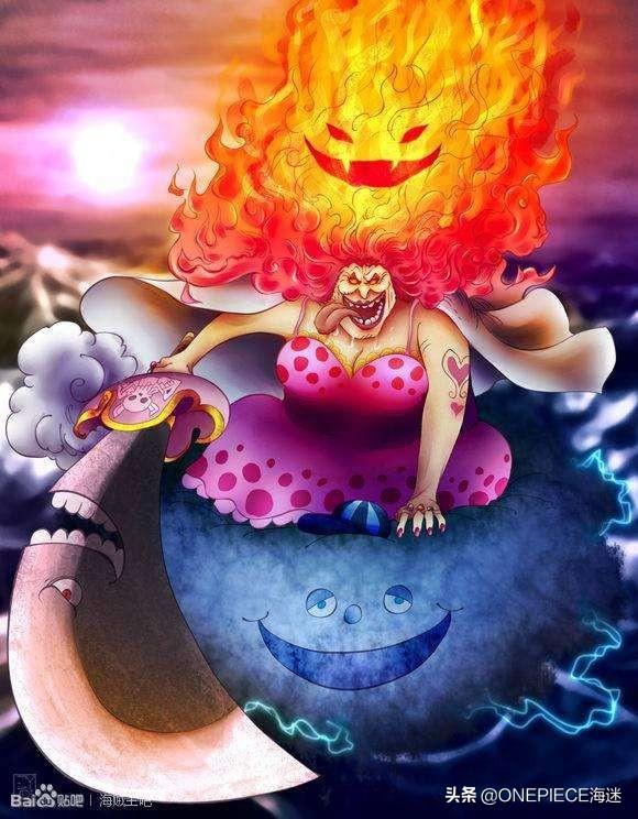 拥有三色霸气身边跟随双角帽拿破仑,雷云宙斯,太阳普罗米修斯,强度也是数一数二的实力,患有思食症,一旦发作,会陷入癫疯,四处乱打。路飞见到大妈也毫无还手之力,即便是开了4档也是轻松应对,路飞一伙在大妈暴走的时候,只能选择逃跑,而且大妈对果实的认知也很强,可以自由操控灵魂,甚至操控寿命,她可以借助她的能力,给多种生物赐予生命,还有就是物理攻击的极限,这里指的物理攻击是指无意识状态下BIG.MOM的尖叫,这种尖叫所造成的实体伤害使茶会现场所有的强者都十分痛苦,有的甚至直接无法承受。并且其声波所产生的风压可以摧毁炮弹、以及所接触的实体,这种威力的声波以及风压打破了太多人的认知。也正是因为BIG.MOM恐怖的声波,直接粉碎了卡朋.贝基的四皇暗杀计划,所以大妈的实力还是很强的,而且他身边的儿子女儿都有这很强大的能力