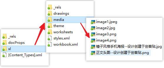 Excel等信息存放在解压后的xl文件夹中的media文件夹里,如图是获取Excel中所有图片的步骤。