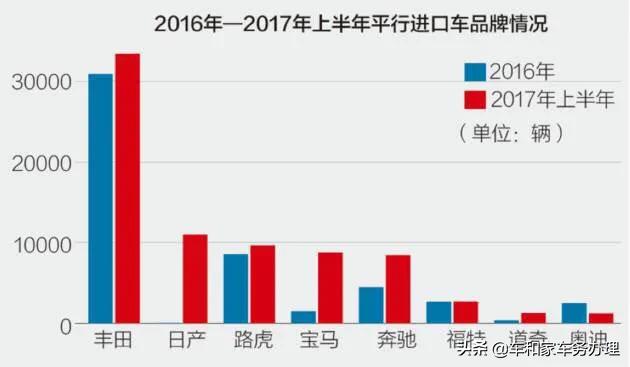 据了解2016年,丰田、路虎、奔驰、福特、奥迪、宝马六大品牌占比达96%。因酷路泽和霸道两款车型的大量平行进口,丰田平行车进口份额最高,单一品牌占比超50%,保持有绝对优势。2017年上半年,日产后来居上,进口量大幅增加,一跃成为平行进口半年度第二大品牌,路虎、宝马、奔驰等紧随其后。