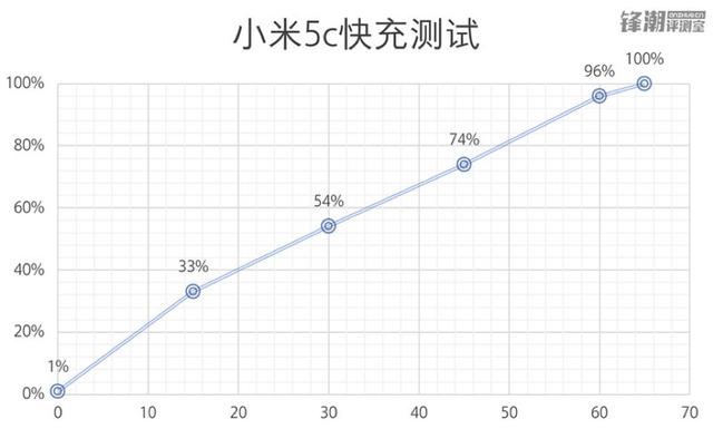 小米5c搭配的是9V/2A的澎湃快充。看规格虽然只有18W,但是实际充电速度相当惊人,5分钟充入大约10%,15分钟充入33%,从1%→100%只用了65分钟,几乎是小米旗下手机中充电最快的手机。续航不够,快充来凑