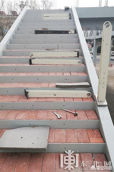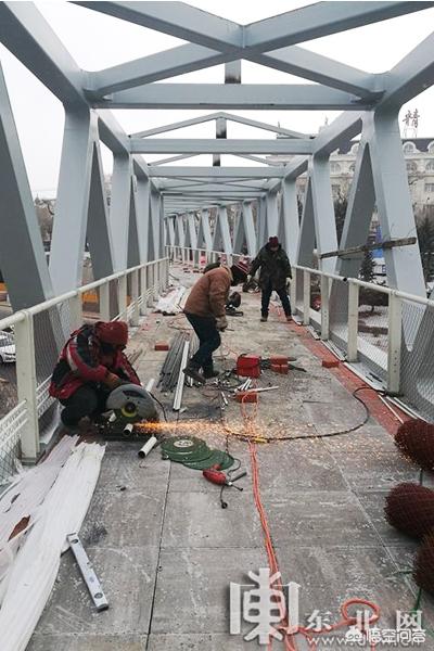 16时,记者来到天桥附近,看到桥身整体为钢结构,从兆麟街通往哈站北广场,横跨经纬街,有两处上桥口,楼梯位于哈尔滨市道里区兆麟街与电车街街口。桥中心位置,有三四个工作人员正在施工,钢结构的台阶槽里都是红砖,两侧扶手还没有安装栏杆。一名工作人员告诉记者,他们已经在此施工一周,预计再有两三天就可以完工投用。