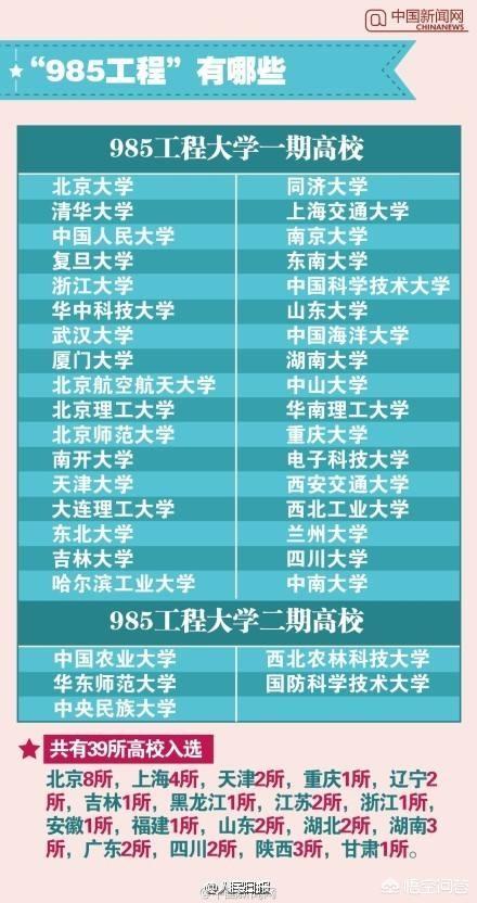来源:985工程大学也叫世界一流大学:1998年5月4日,时任国家主席江泽民在庆祝北京大学建校100周年大会上向全社会宣告:“为了实现现代化,我国要有若干所具有世界先进水平的一流大学。”全国目前有39所。