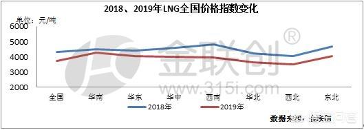 据金联创观察,受宏观经济形势不景气、环保安全检查频繁、"煤改气"继续以气定改等因素影响,中国LNG需求"旺季不旺",因此2019年中国LNG出厂价格比去年有明显下降。据金联创LNG价格指数显示,2019年LNG全国价格指数为3735元/吨,较去年下滑了13.49%。