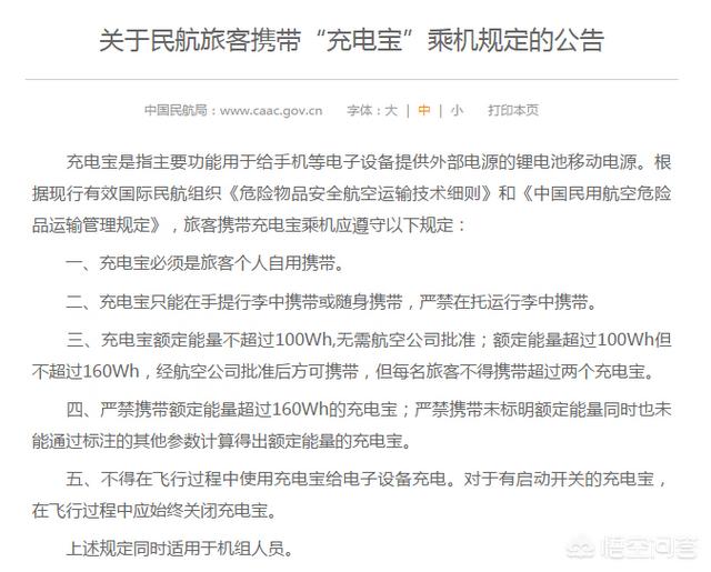 民航局关于携带充电宝乘机的规定