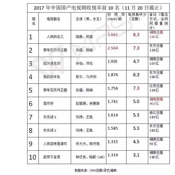 在排名二至六的几部剧多为大女主戏,电视剧的展开多为围绕女主角展开,《那年花开月正圆》中的孙俪,《前半生》里的马伊琍,《因为遇见你》中的孙怡都是如此。而且电视剧的观看本身就是女性观众为主,也是这一类片子受欢迎的原因。