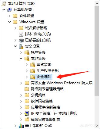 2:依次打开:“计算机配置→windows设置→安全设置→本地策略→安全选项”,如图