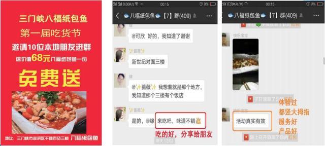 再比如,三门峡纸包鱼通过免费赠送的方式,将原来的3个群共240人,两天时间裂变到1500人,其实总成本不超过2000元。