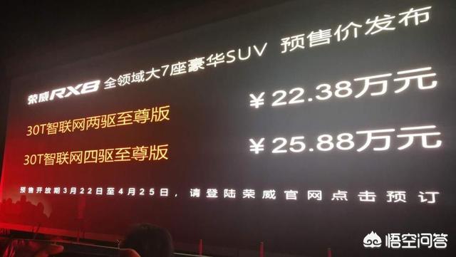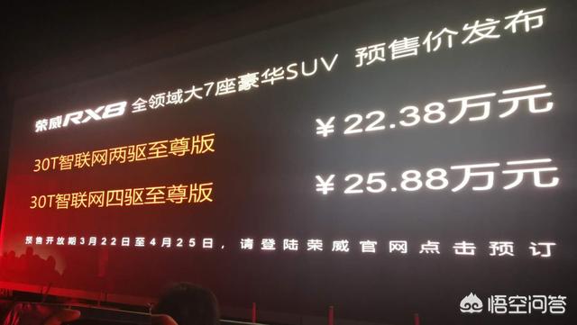 首先更正下,22万-25万的是预售价,也是两款版本的顶配车型。4月25日,北京车展上,荣威RX8公布了正式售价16.88万元-25.18万元,新车分为两驱和四驱版本,除丐版车型是5座外,其余均为7座车型。