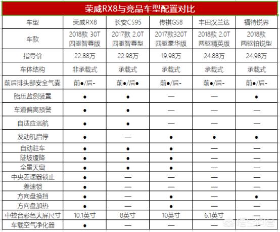 至于和丰田汉兰达、福特锐界的比较,荣威RX8的配置要甩它们几条街了,合资品牌仗着自身的技术优势,在驾驶配置和安全配置上真的是“寒酸”。