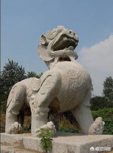 到了南朝时期,麒麟雕塑变得雄壮魁梧,接近狮子、老虎等猛兽的形象,足部也多为兽爪,仍带有肩翼。经常与双角的天禄并设于陵墓前。