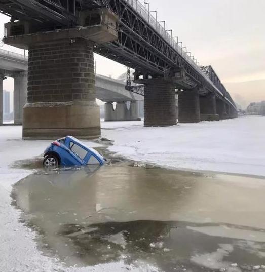 2017 年 12 月 9 日,一辆轿车在松花江哈尔滨市区江北段,松花江特大桥西侧,半个车身扎进冰封的松花江内。 当日 14 时许,记者来到了事故现场。从桥上鸟瞰,一辆小蓝车扎进冰封的松花江内,距离大桥桥墩不足 10 米,距离北侧半边不足 20 米。车辆压碎冰面后,溢出的江水将附近十几平方米冰面覆盖。车辆的前右侧车窗玻璃已经落下,仿佛在肇事的一瞬间驾驶员从车窗内逃生。
