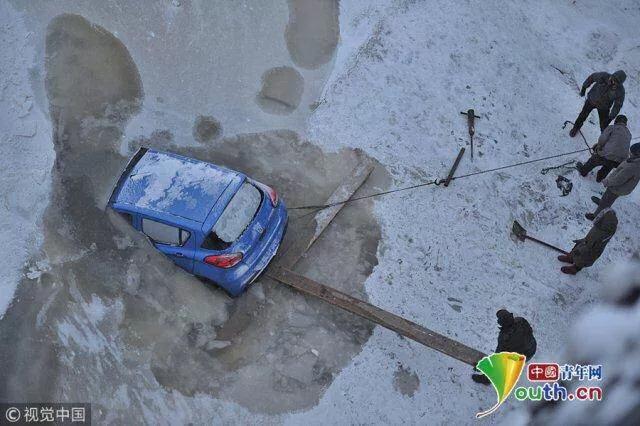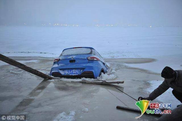 8日晚上,在哈尔滨铁路桥江段,一辆蓝色宝骏SUV掉进了江里。蓝色车车头插入江中,由于气温较低,整个车被冻在了江面上。据说车主本来打算带母亲去太阳岛,没成想江面突然开裂,幸好,车里的人都及时逃出。