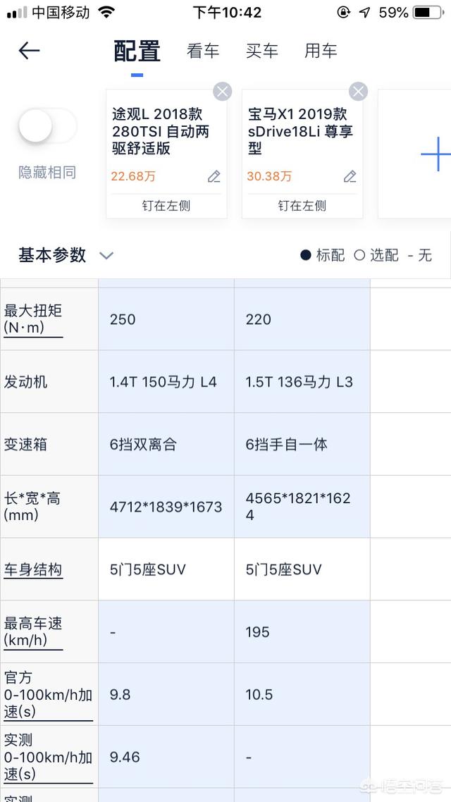车身尺寸,配置差异直接就可以在网上对比,首先你要明确自己的定位,如果你想花途观L的钱买豪华品牌的SUV,那只能是入门级的低配,你买宝马X1是豪华品牌的入门级享受,但是维修保养费用可以一点不会含糊