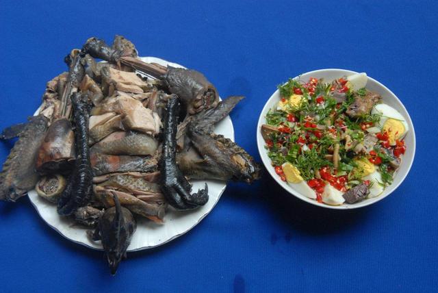 小米辣、小分葱、大小芫荽、苤菜 根、花椒、姜、蒜等十多种材料切碎后连同与鸡一起煮的鸡蛋,鸡血、鸡杂一起放入碗中,然后舀上一勺满满的鸡汤放进去,绝顶美味的独特哈尼蘸水就做好啦,让你吃上一次就难以忘记。