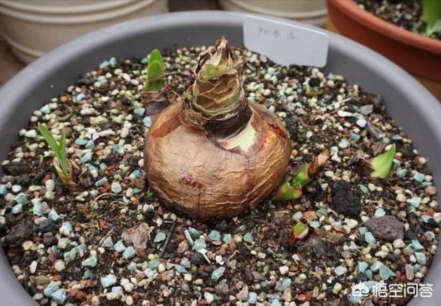 4.都说浅埋养花,深埋养苗。朱顶红的球根埋的深一点的话,其叶片长得多且大,可以制造很多养分以生出更多的小球球,繁殖扩散。朱顶红埋浅一些,露出三分之一的,就是为了促花。