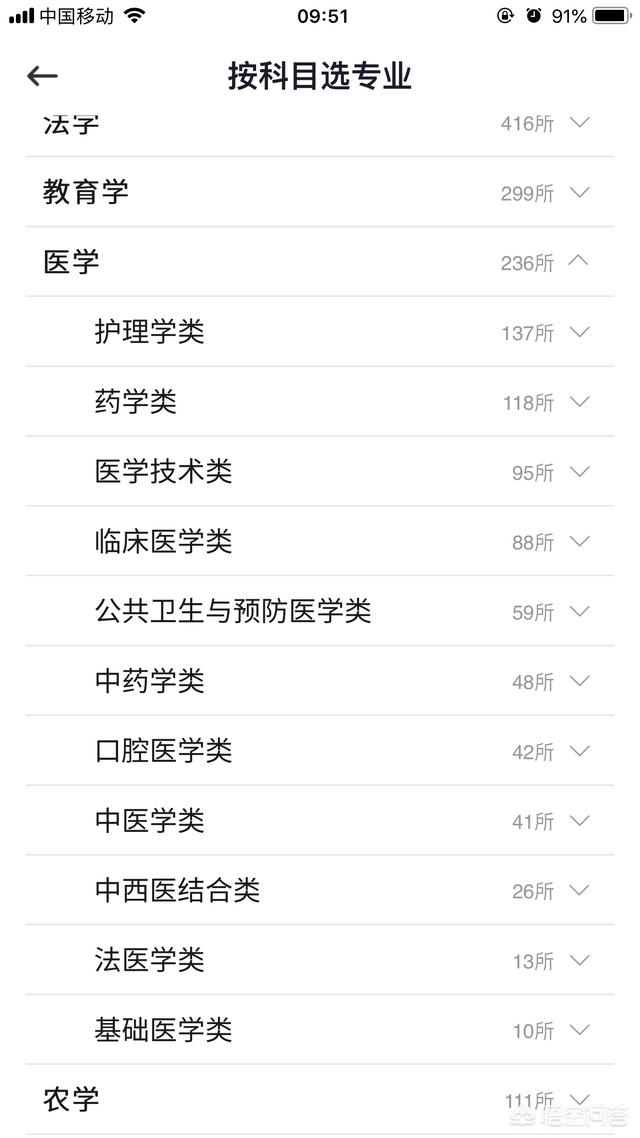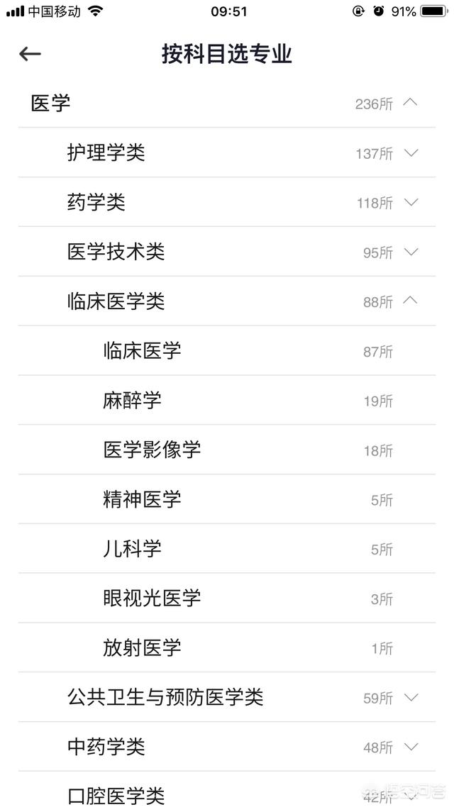 那我们就还可以点开看一下医学类专业有哪些。假定:孩子想要报考临床医学专业。,那么我们可以点开这个专业类别,看看下面还分支着哪些细小的专业小类。