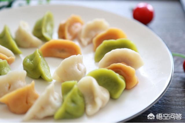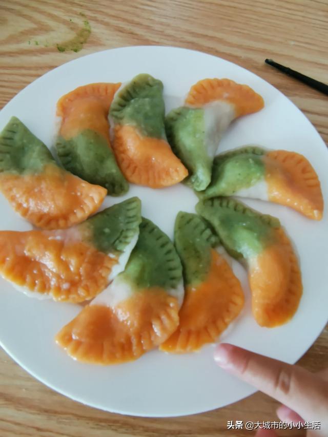 3、将蔬菜打成汁,加入面粉中,做成彩色面条、饺子,看起来特别漂亮,也会让孩子更有食欲。