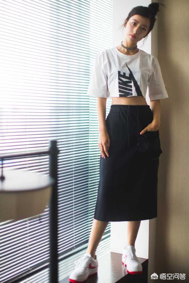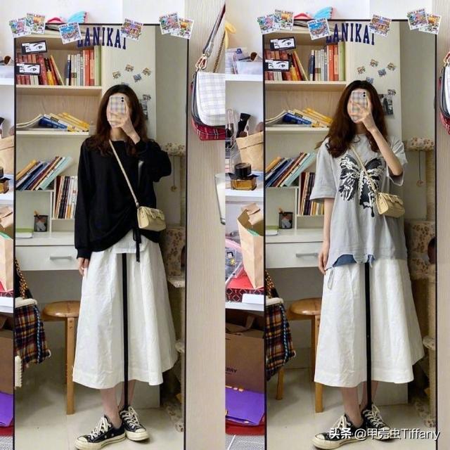 - A字半身裙,这个我得重点说一下,这样的半身裙很容易打造bf风格,学院风格,所以搭配难度也是非常低的,只不过裙子的长度以及上装的长度自己一定要根据自身比例把控好,不要选择超出自己比例的穿搭,很容易显矮哦