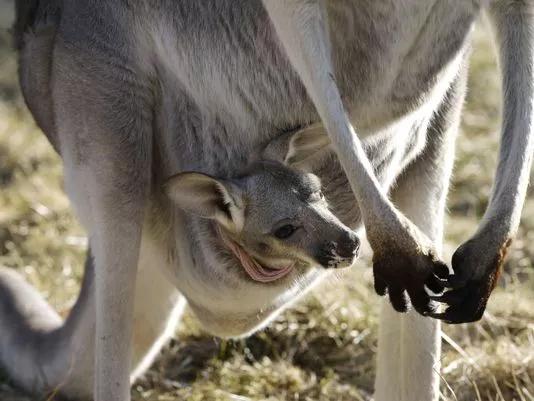 袋鼠是有袋动物。有袋动物既没有卵生动物发达的卵黄为胎儿提供养料,也没有咱们胎盘动物发达的胎盘,可以让胎儿直接从母体获得养料,发育所需的营养几乎完全从奶水中获得。袋鼠孕期很短,初生的小袋鼠发育非常不完全,育儿袋代替子宫起到了保护幼体的作用。