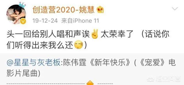 查看姚慧的微博,和很多有一定演艺经历的姑娘相比,她的确算是一个小透明,参加《创造营2020》之前, 姚慧和娱乐圈唯一沾边的,拿的出手的成绩,是给陈伟霆的歌《新年快乐》做和声。