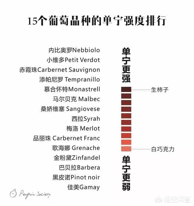 以上是15个常见红葡萄品种的单宁排行,可以由弱到强逐渐深入!