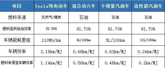 可以看出,电动车最大的能量损失在发电那一刻——美国现时好的火力发电站,算上电网传递损失,到加电站后效率大概只有52.5%。而从石油产地,再到提炼汽油等一系列损失后,到加油站时仍然有81.7%效能。但是一旦传递给车之后,最终的燃料至车辆的效能,Tesla的纯电动车比混合动力车高了一倍有多,比同级别的高性能车高了5倍!