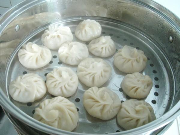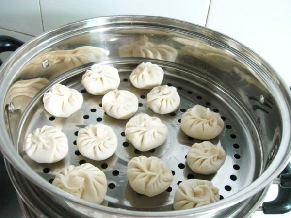 3、包生煎也是一门技术。做得好的皮薄,馅足不外露。生煎做好了一排排地放在平底锅里油煎,在煎制过程中还要淋凉水,最后撒上葱花和芝麻就大功告成了。