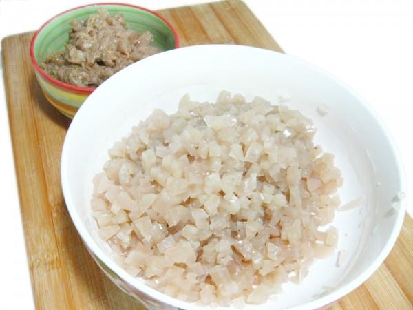 3.大碗里是切成小丁的皮冻,小碗里是猪肉大葱肉馅(肉馅加入花椒水向一个方向搅打上劲,再加入葱末搅拌均匀)