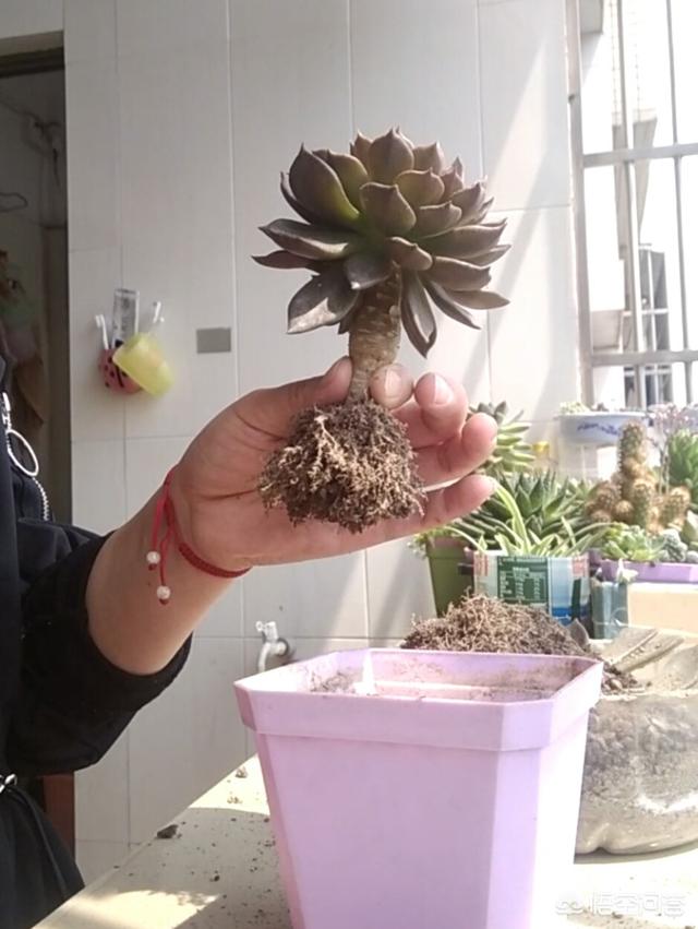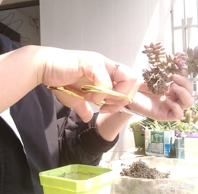 把多肉提起来,把多余的土抖掉,起起的剪,留下1.5厘米长的根,在多肉上就可以了!要是还有多余的干枯的根,给它拔了!多肉根须少的几根的