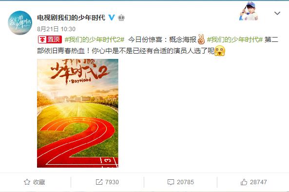 8月21日,《我们的少年时代》官方曝光续集《我们的少年时代2》的概念海报,海报以晨曦下的校园绿茵场为背景,“2”字形的塑胶跑道象征着《我们的少年时代2》正蓄势待发。
