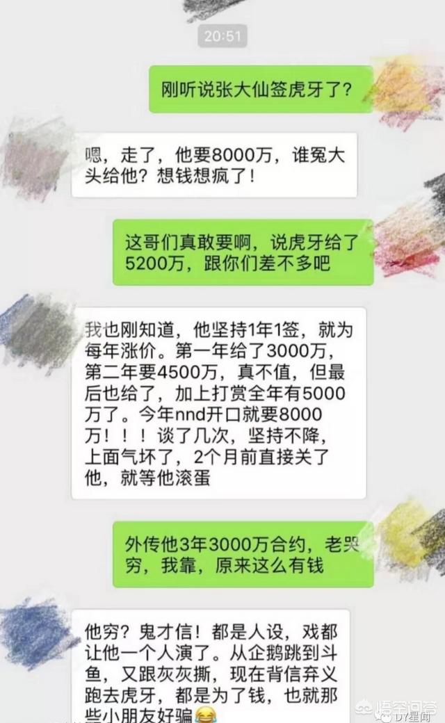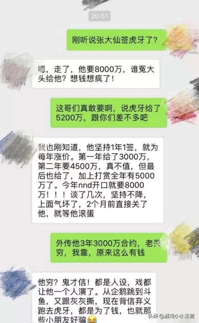 首先这位网友给我们晒了一张微信截图,其大致内容是张大仙要签约虎牙了,双方在合约金的问题上协商了很久,最终大仙以5200万的价格签约了虎牙,而且我们从截图中可以看到,似乎大仙要的价钱比较高,虎牙给得比较少。对此小编想说,这份微信截图简直是在黑张大仙呢,没有任何参考的价值,我们对此完全可以置之不理,再说如今连张大仙本人都没有透露自己要去哪个平台直播呢,这根本是胡乱揣测而已。