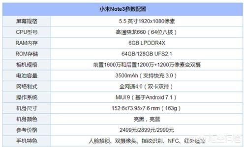 小米note3采用5.5英寸16:9屏幕,支持人脸识别,骁龙660处理器,3500mh电池,支持全功能nfc(公交卡、信用卡、HUAWEIpay)前置1600w美颜相机后置双1200w支持两倍光学变焦(不损失画面)四轴光学防抖,小米note3在相机算法是基于小米6的优化算法。也是小米手机拍照素质最高的一款产品。性能体验完全不输OPPOR11和vivox20但是价钱却是2000档。以性能骁龙660和6gb的运行内存来看,再用两年性能也不会掉队,包括人脸识别也是符合潮流,唯一就是没有全面屏。在两年还没之内也不会掉队。