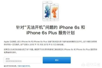 针对\"无法开机\"的苹果6s和6sp服务计划,因为某个组件发生故障而无法开机,受影响的批次为2018年10月到2019年8月之间的设备,手上有这机型的朋友,可以自己上官网确认下是否受影响,有效期为自设备首次零售销售之日起2年,前提条件依然是很苹果,如果有存在影响维修完成的损坏,如屏幕破损之类的,那么不好意思,先付费修完才能进行免费维修