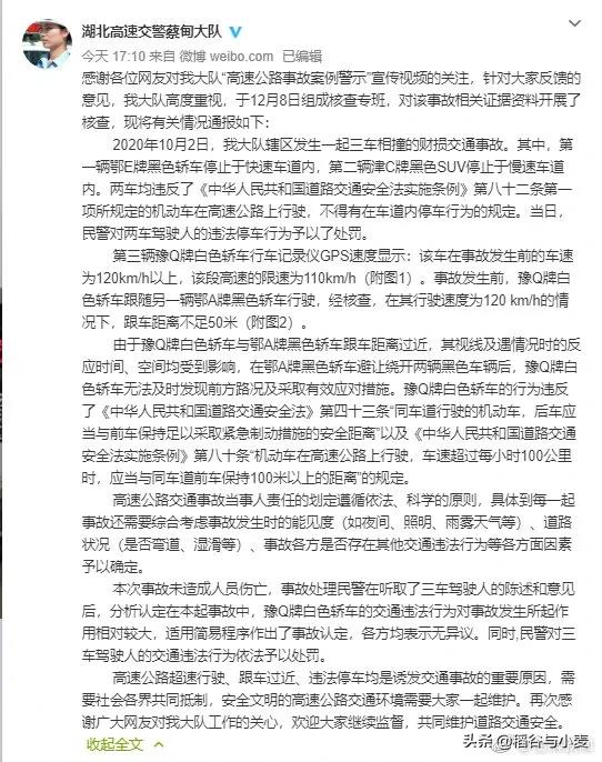 事故本身并不严重,也没有造成人员的伤亡,却引起了广泛的关注。主要原因就在于当地交警对事故责任的划分让很人无法理解。湖北高速交警蔡甸大队认为此次事故的主要责任在于后面的白车超速行驶且没有保持安全驾驶距离。