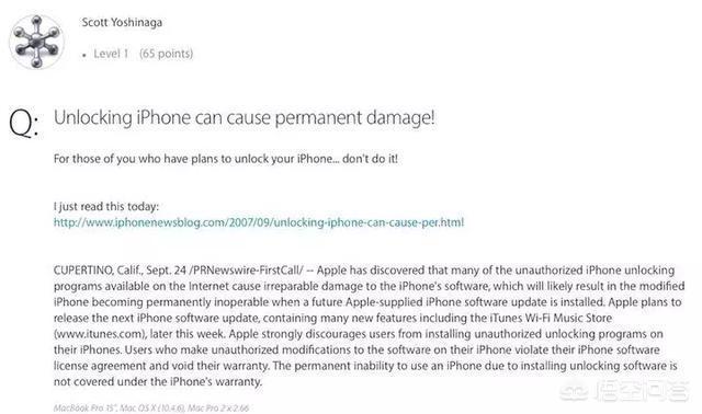 ▲早在 2007 年苹果就发表声明警告用户越狱带来的风险