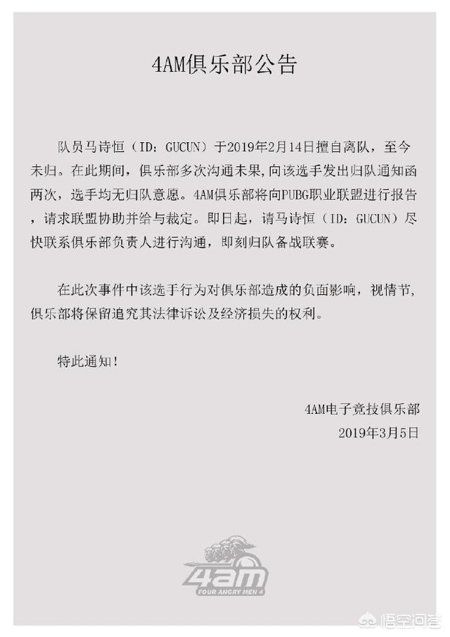 队员马诗恒(id:GUCUN)于2019年2月14日擅自离队,至今未归。在此期间,俱乐部多次沟通未果,向该选手发出归队通知函两次,选手均无归队意愿。4AM俱乐部将向PUBG职业联盟进行报告,请求联盟协助给与裁定。即日起,请马诗恒(ID:GUCUN)尽快联系俱乐部负责人进行沟通,即刻归队备战联赛。