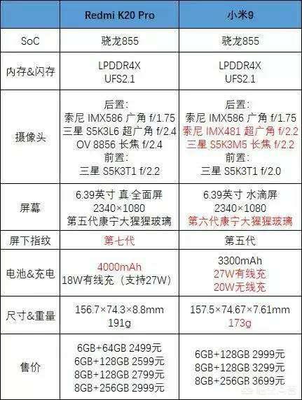 价格方面肯定是红米K20 Pro便宜,还多了6+64GB版本,最低可至2499元,6+128GB的售价为2599元,8+128GB为2799元。(PS:购买手机可以留意电商大促时间节点或许能更便宜)
