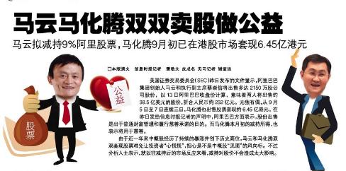阿里董事局主席马云和副主席蔡崇信拟在自2017年10月起的12个月內,合计出售约值38.48亿美元,相当于300亿港元。最多2150万股阿里巴巴股票,以用于财富策划及慈善用途上。马云拟在自今年10月起计12个月內,出售最多阿里巴巴1600万股股份,占他所持阿里巴巴股份的9%,约185亿人民币。