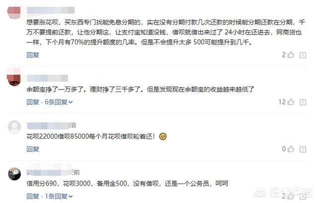 对于花呗与借呗额度提高网友也是给出不少方案,有网友表示:想要涨花呗,买东西专门找能免息分期的,实在没有分期付款几次还款的时候能分期还款再分期,千万不要提前还款,让他分期着,让支付宝知道没钱,借呗就借出来过了 24小时在还进去,网商货也一样,下个月有70%的提升额度的几率。但是不会提升太多 500可能提升到几千。