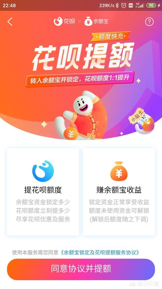 注意事项:花呗额度快充提额是通过在余额宝里锁定资金方式,按1:1的比例来提高花呗额度,但是提升的并不是永久额度。用户在余额宝锁定多少钱,支付宝花呗就会提高多少额度。因此一旦把锁定的资金全部解冻,那通过锁定资金提高的额度也会降低到原来的额度。