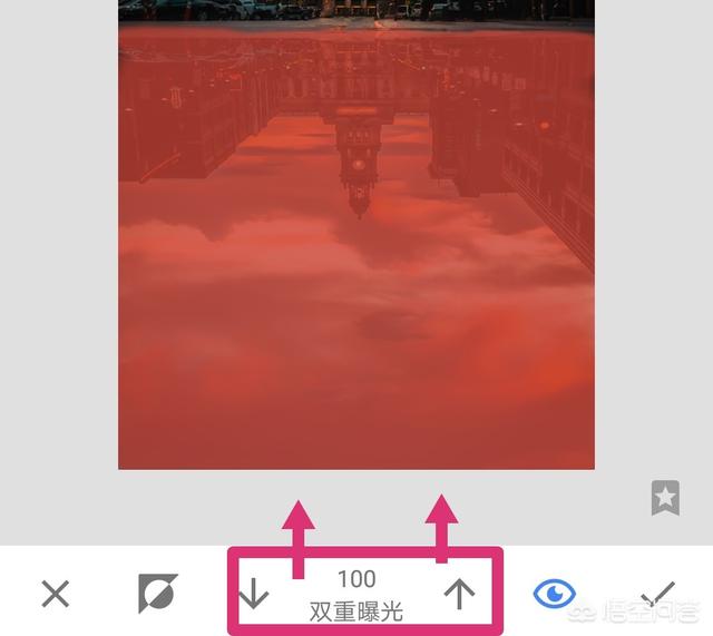 (6)进入到新的界面,把下方双重曝光数值调为100,对后添加倒影部分,涂抹。两图相接边缘,需要把照片放大后,再涂抹。