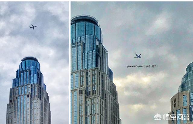 ▼利用天空为背景,拍大厦的局部(正好飞过一架飞机),抓拍下局部画面。