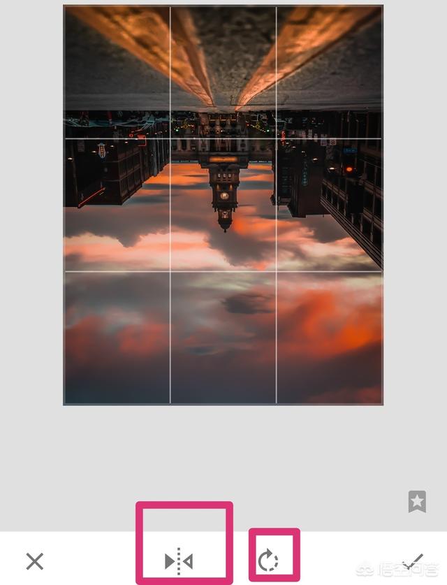 (1)用手机修图软件Snapseed打开建筑照片。工具,旋转。点一次镜面翻转,点两次向右翻转,把原建筑照片变成倒影。导出,备用。