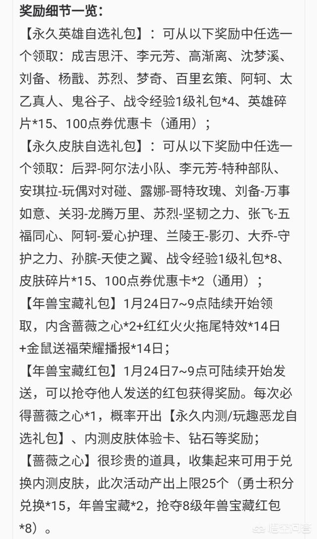 其次,就是对于奖励方面,我们可以一起来看一下啦,主要分为永久英雄自选礼包,永久皮肤自选礼包,年兽宝藏礼包,蔷薇之心等等。