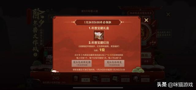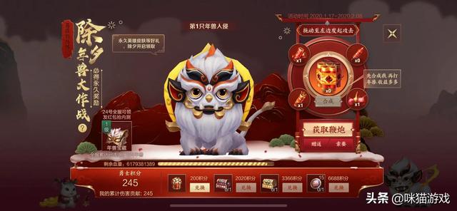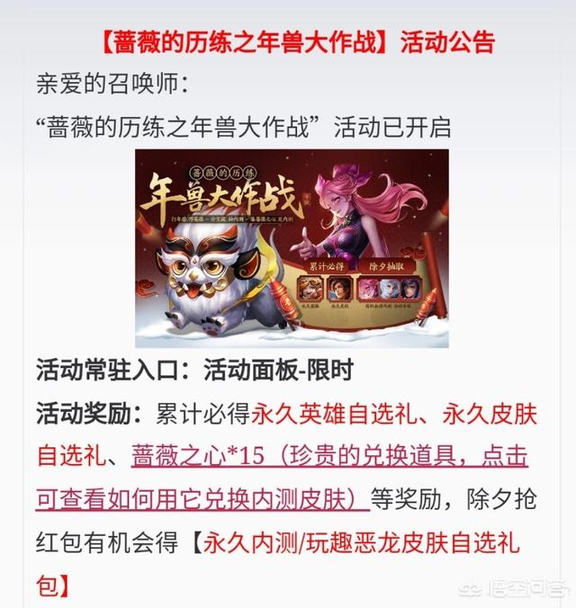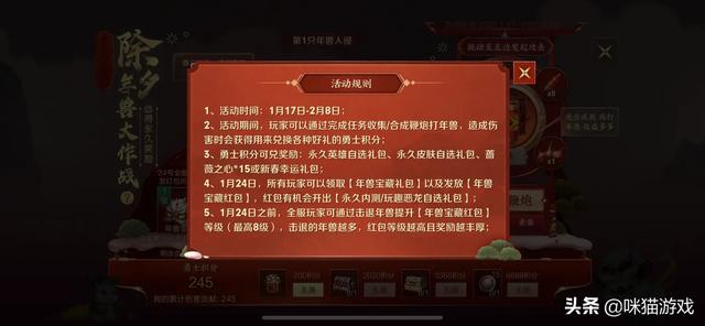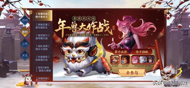 这个活动是刚刚开始的一个活动!玩家可以通过活动->限时活动->年兽大作战进入这一个活动页面!这一个活动也是非常的简单!最主要的还是活动的奖励很诱人!玩家可以获得一款永久皮肤和一位英雄!运气好的玩家可以获取到内测皮肤!